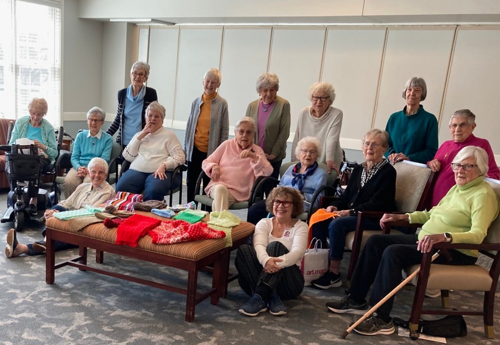 To this day, my 91-year-old mother still puts others before herself. One of her favorite ways to show this is with her knitting group. “Loose Knit” members get together weekly at the Windsor of Savoy, where they knit hats, scarves and mittens which are then donated to OSF for distribution.